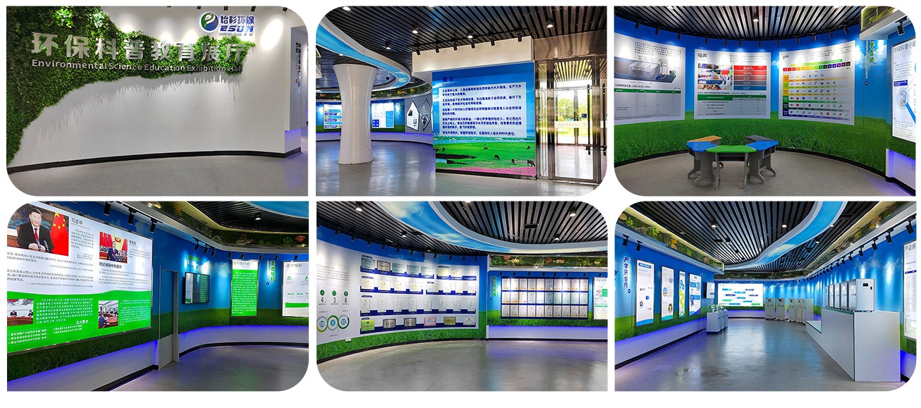 室内环保科普展厅面积为750平方米,以科普环保知识为目的,以常设展览教育基地、影视放映等为主要功能,主要从介绍世界和国内重大环保污染事件开始,普及热点和常见环保知识,教育学生环保从小做起,从身边做起,同时呼吁全民参与低碳减排、植树造林等爱护环境的活动,共建社会美好生态环境。整个展厅分为7部分,分别为“序厅”、“国内外今年主要污染事件”、“心系环保”、“产学互动”、“领导关怀”、“走进怡杉”、“怡杉智慧生态平台(影视报告厅)”。